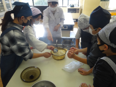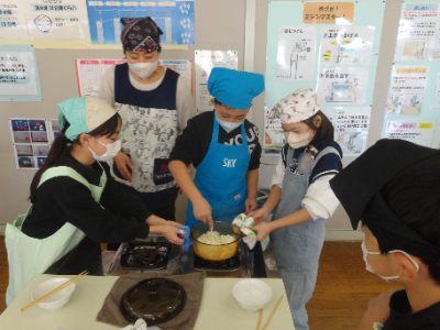 5年生は、家庭科の時間に、ご飯を炊く調理実習です。炊き上がってふたを開けるとご飯のよいにおいが立ち上がります。