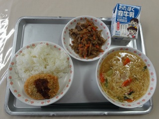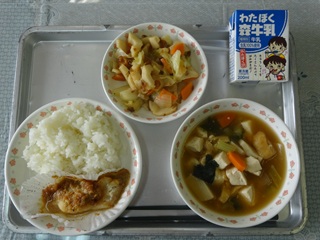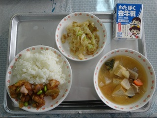 11月になりました。日に日に秋も深まってきましたね。実りの秋です。食べ物や食べられることに感謝の気持ちを忘れずに、食べ物を大切にいただきましょう。今日は、学校給食から広まっていった料理、「チキンチキ ンごぼう」をつくりました。山口県の給食で出されたものが県民食となったそうです。今日の給食では、小さめに切った鶏肉と薄切りしたごぼうに片栗粉をまぶし、油で揚げたものを甘辛く味付けしました。よくかんで食べるとうま味がでてごはんのおかずにもピッタリです。もりもり食べましょう!
