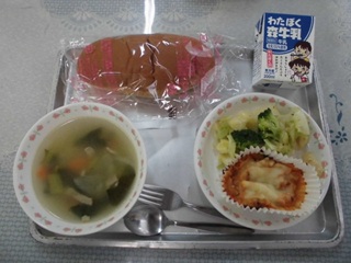 11月は彩の国ふるさと学校給食月間です。地元産の食材や郷土食などを味わったり、食べ物や給食をつくってくれる人たちに感謝の気持ちを表したりすること心がけ日々の食事を大切にしましょう。そこで、今日の給食は、「ラッキーにんじんを見つけよう」です。汁物の中のラッキーにんじんを見つけて、最後までおいしくの残さず食べてくださいね。