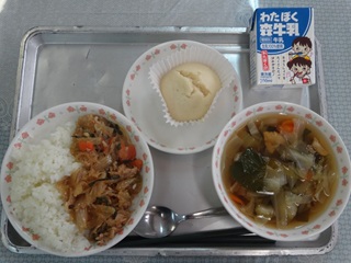マーラーカオは、中国風蒸しカステラやマレーシア風カステラなどとも呼ばれています。日本へは、江戸時代に中国から伝わったそうです。古くから食べられているお菓子なんですね。しょうゆが使われているのが特徴で、ふわふわした食感がおいしいです。今日の給食では、豆乳を使って、やさしい味わいにできあがりました。おいしくいただきましょう!