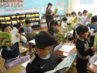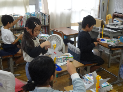 1年生は、国語の音読です。本をもって姿勢よく元気な声で読みます。3年生は、理科の時間。風のはたらきを調べる道具を作成しています。