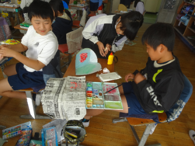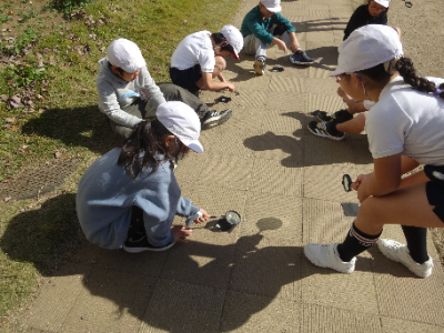 3年生は理科の授業です。虫眼鏡で光を集めたときに熱が発生することを確かめています。4年生は図画工作の時間です。好きな本の世界を立体に表しています。